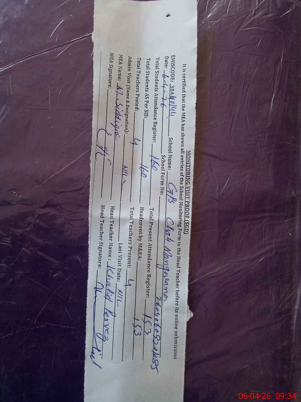 | Attendance Register | Head Teacher | MEA with School | Visit Proof |