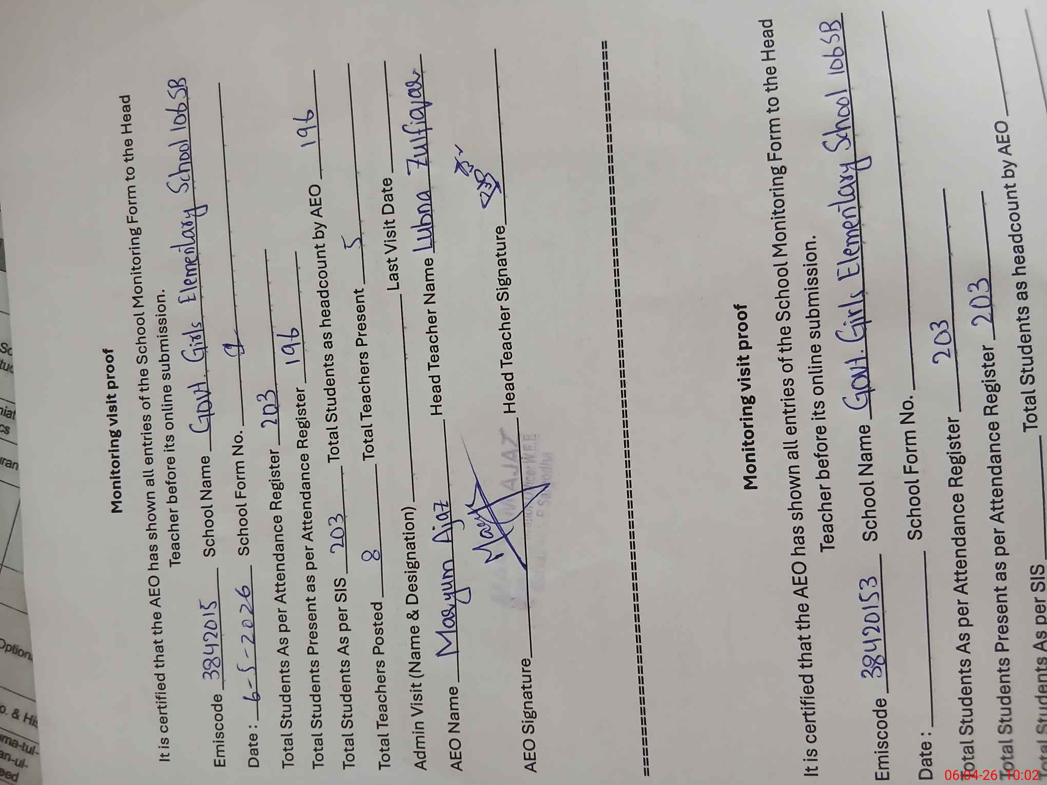 | Certified that this School was Inspected by the Undersigned MEA/DMO Today and the Information Stated Above is as Per Record. | |||||