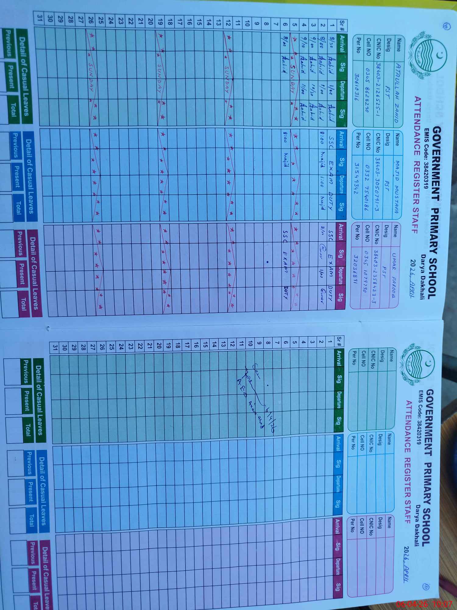 | 38**** | Um**** Fa**** | PST Science/Maths | Regular | 0 | 0 | 0 | 0 | 0 | 0 | 0 | 0 | 0 | Exam Duty |