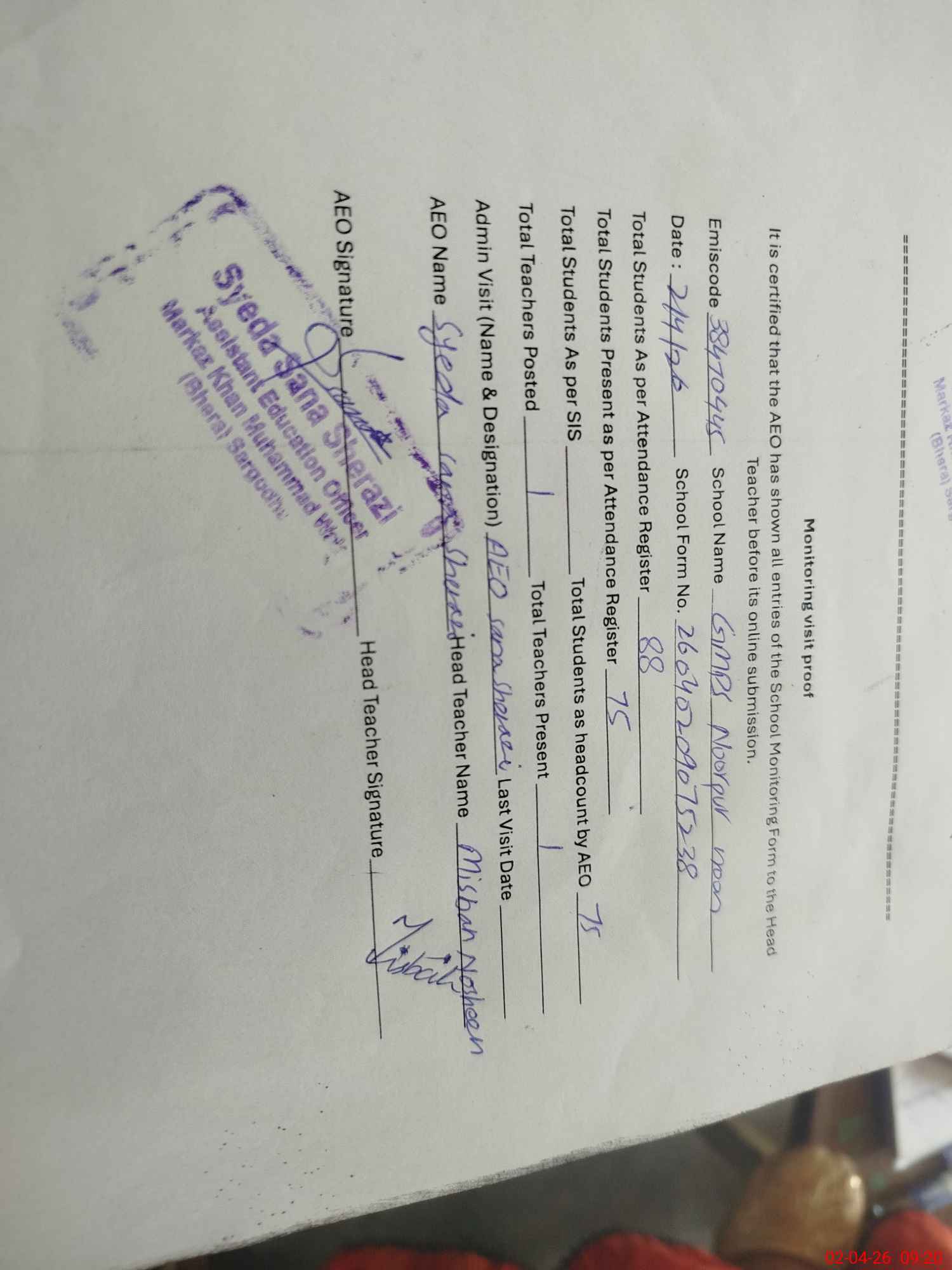 | Monitoring Date: 02-04-2026 | Start Time: 02-04-2026 09:01 AM | End Time: 02-04-2026 09:38 AM | Name of MEA: SY**** SA**** SH**** | |