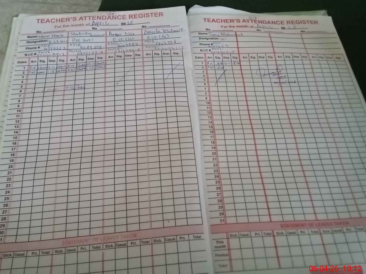 | Name: NA**** PE**** Designation: (School Headmaster's/Headmistress's) PST Phone/Cell Number: 03**** |