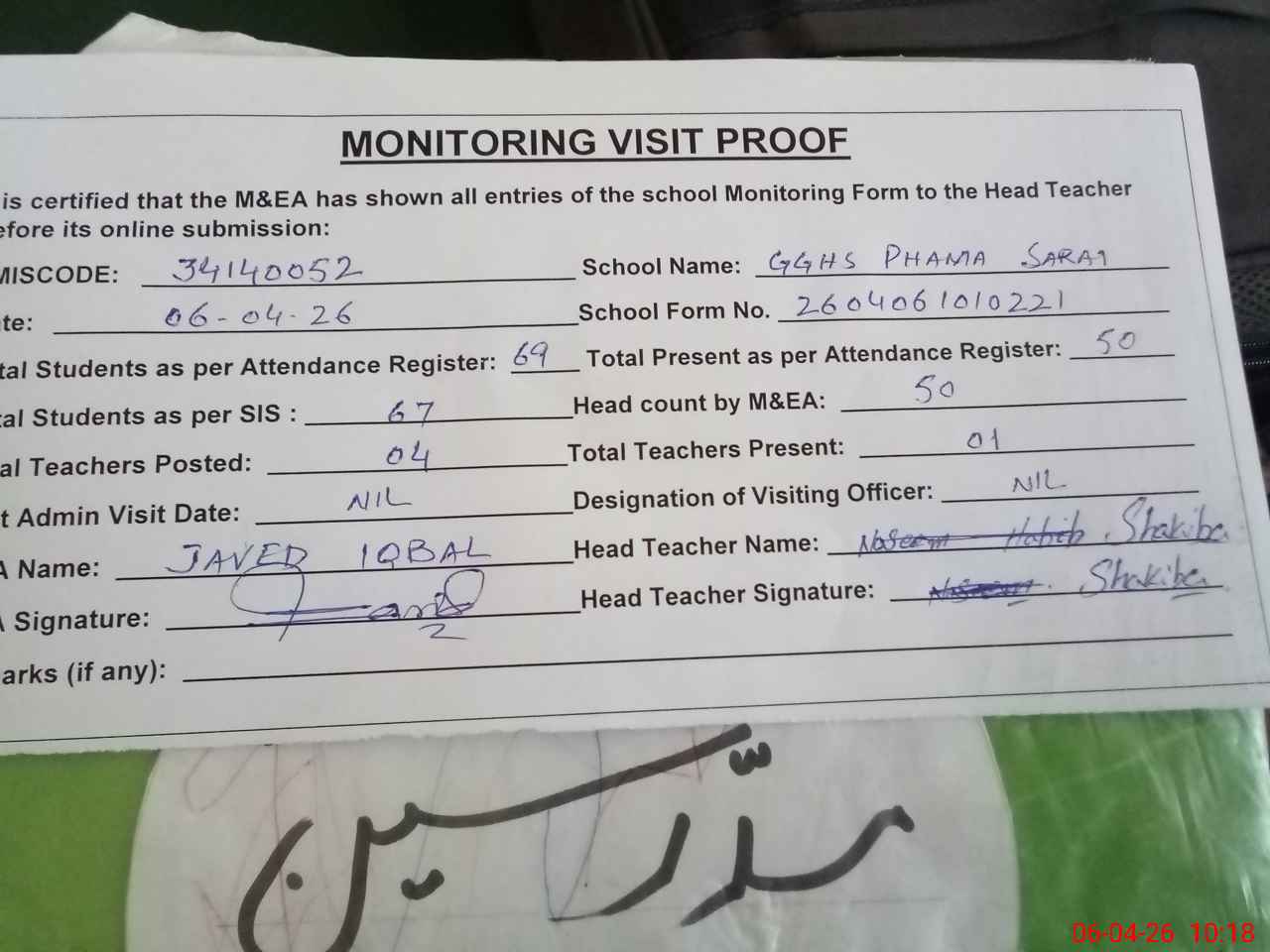 | Attendance Register | Head Teacher | MEA with School | Visit Proof |