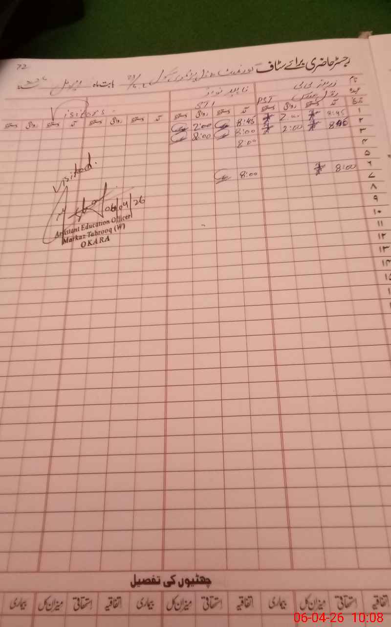 | District: OKARA | Tehsil: OKARA | Markaz: TABROOQ - FEMALE | Level: Primary | |