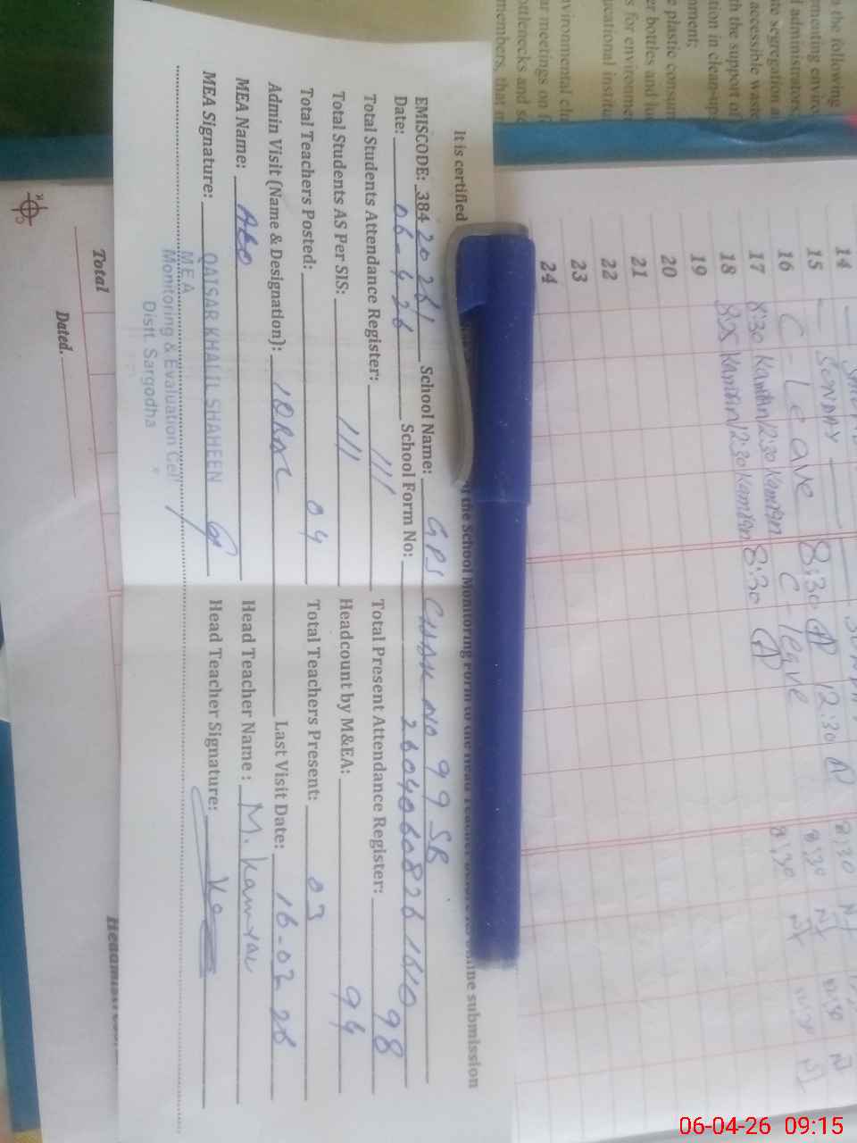 | Attendance Register | Head Teacher | MEA with School | Visit Proof |