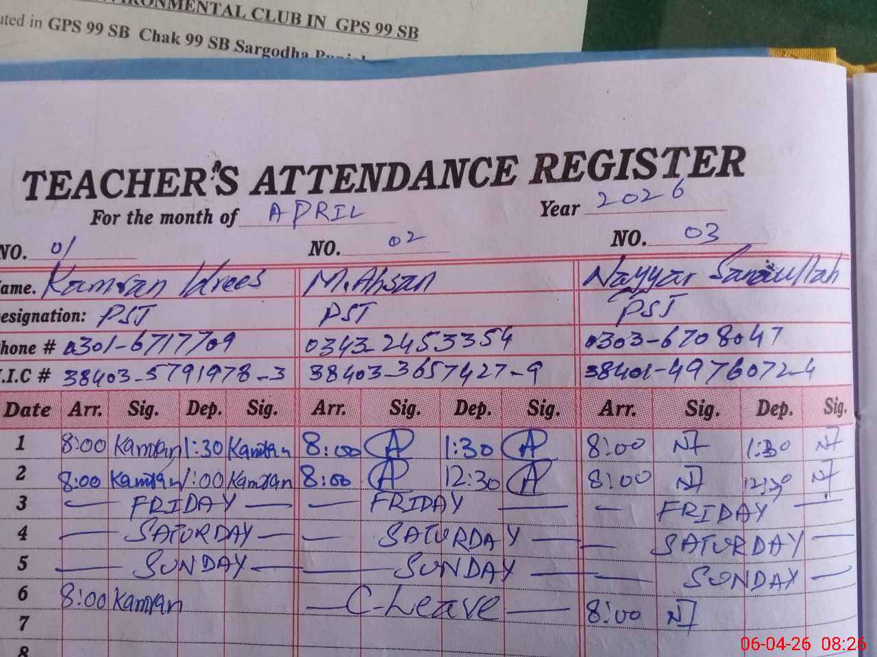 | CNIC | Full Name | Designation | R/C | Absence During Last Calender Month |