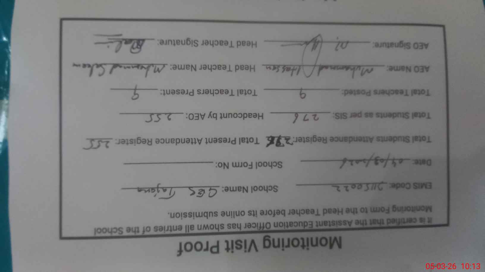| Attendance Register | Head Teacher | MEA with School | Visit Proof |