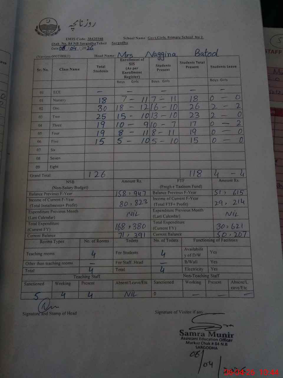 | District: SARGODHA | Tehsil: SARGODHA | Markaz: CHAK 84-NB - FEMALE | Level: Primary | |