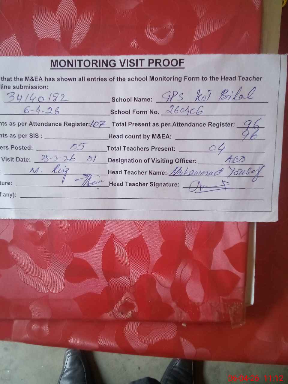 | Attendance Register | Head Teacher | MEA with School | Visit Proof |