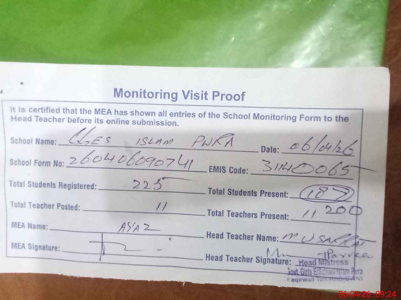 | Attendance Register | Head Teacher | MEA with School | Visit Proof |