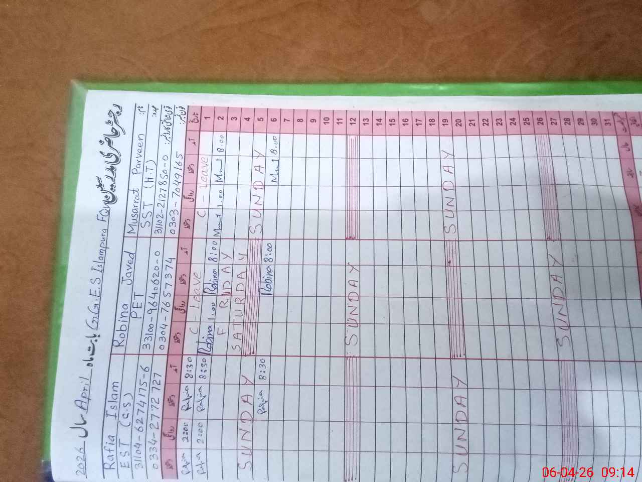 | 31**** | Ma**** Bi**** | EST Urdu | Regular | 0 | 0 | 0 | 0 | 0 | 0 | 0 | 0 | 0 | Exam Duty |