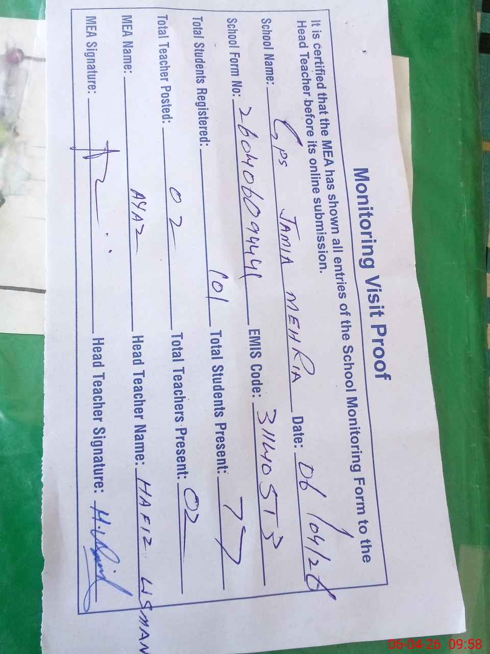 | EMIS Code: 31140513 | Name of School: GPS JAMIA MEHRIA | |||