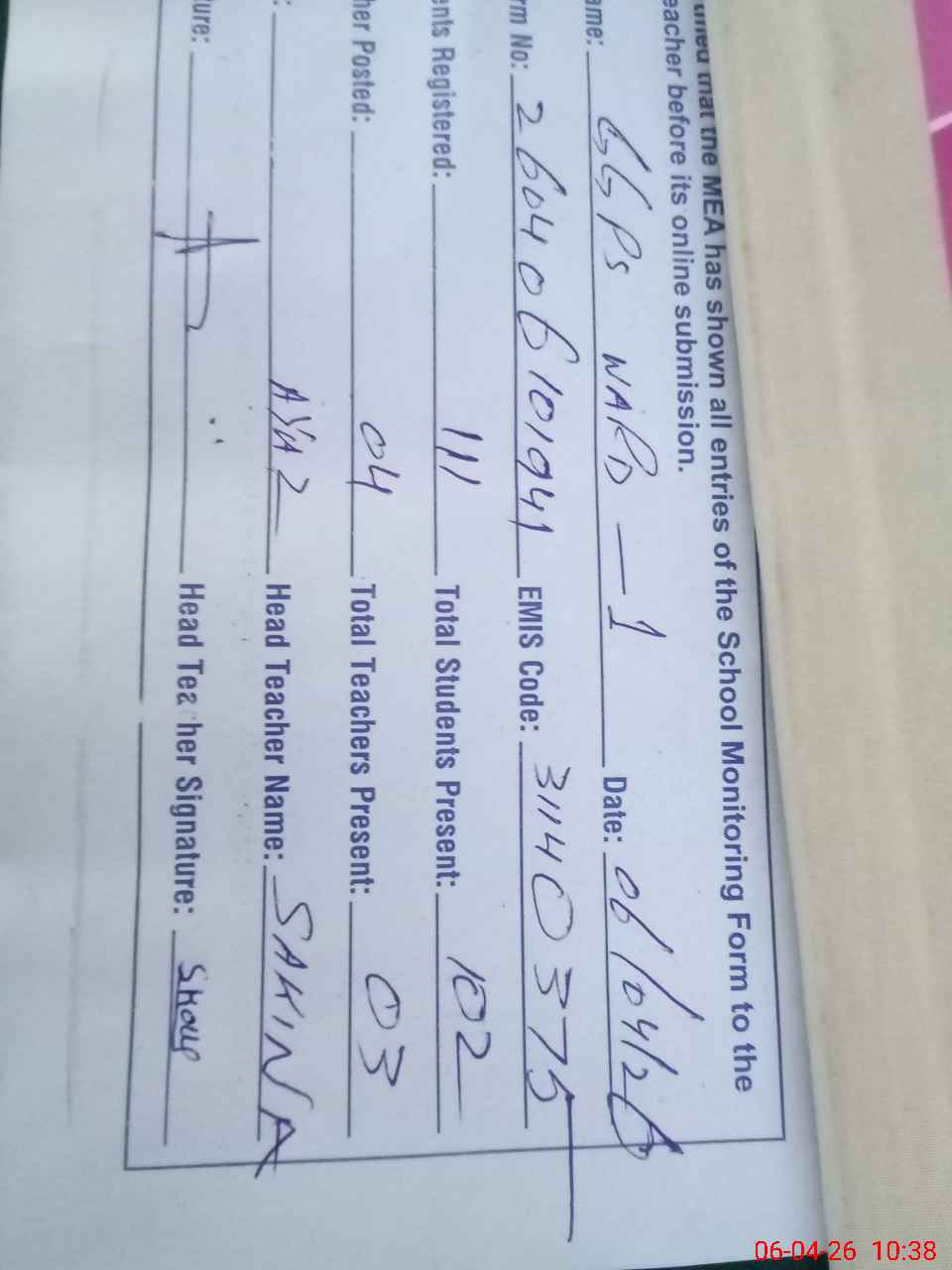 | Name: SH**** ME**** Designation: (School Headmaster's/Headmistress's) PTC Phone/Cell Number: 03**** |