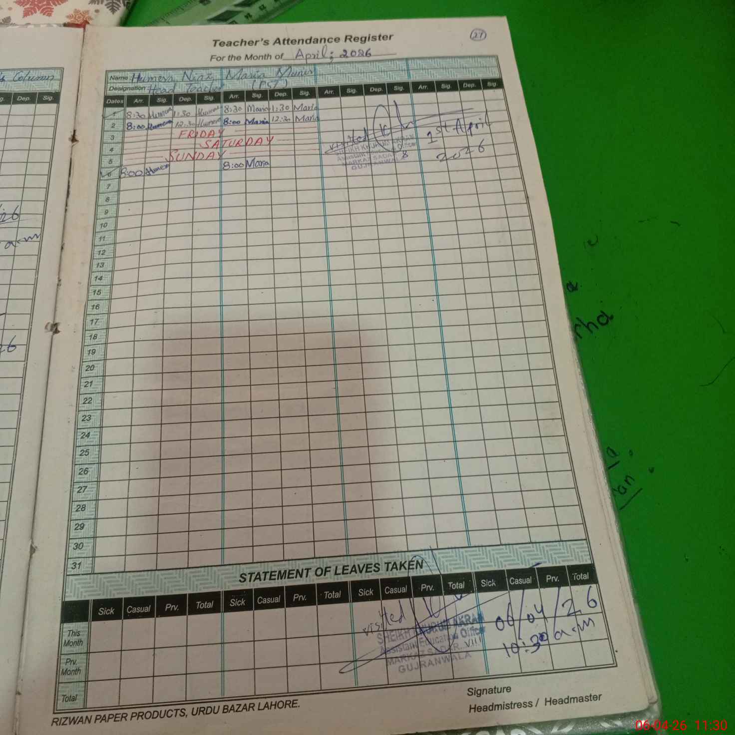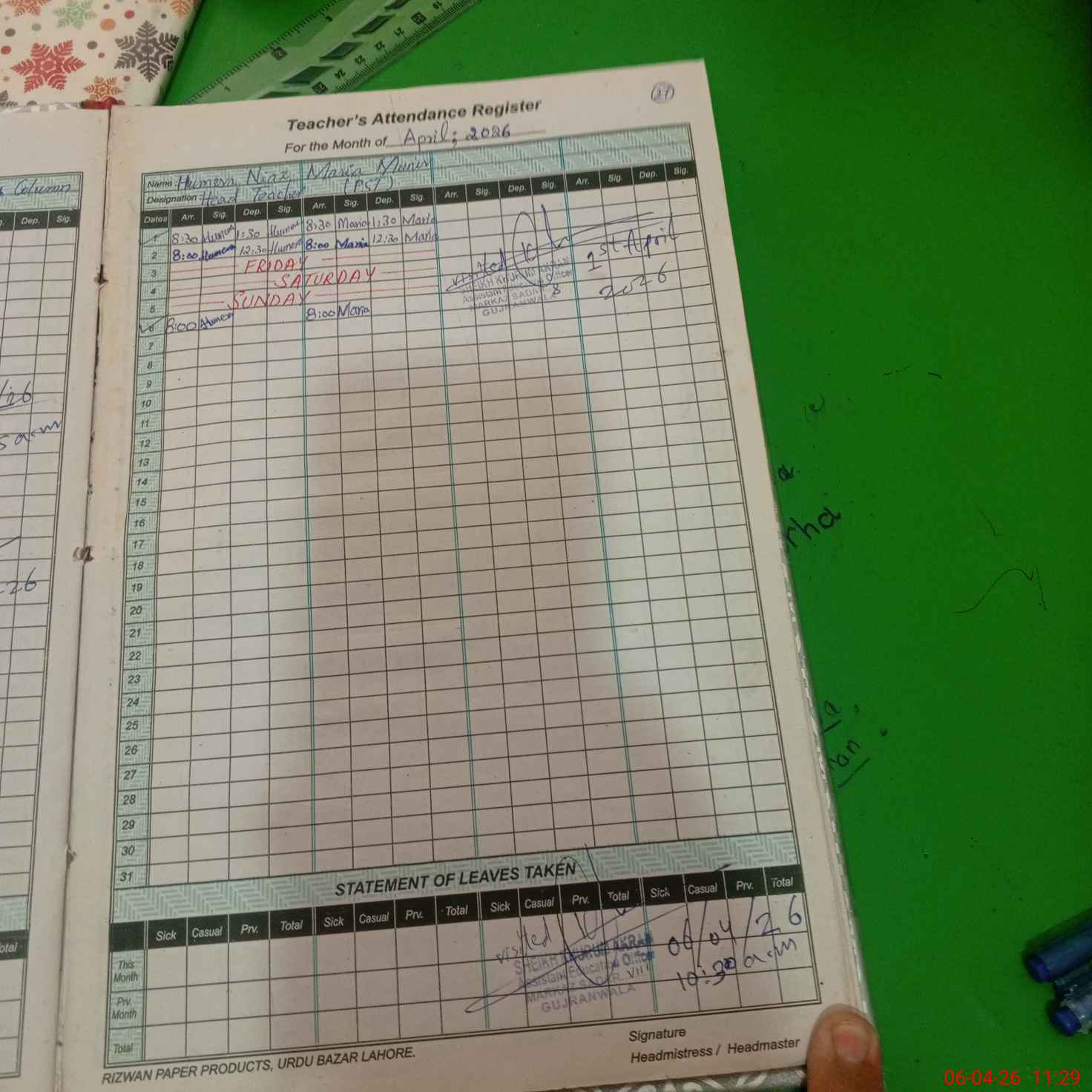 | Remarks (Use Separate Page if Required): 1- Plantation Compaign is going on. 2- New Admissions Compaign is in progress. 3- Teachers have been found involved in teaching. | |||||