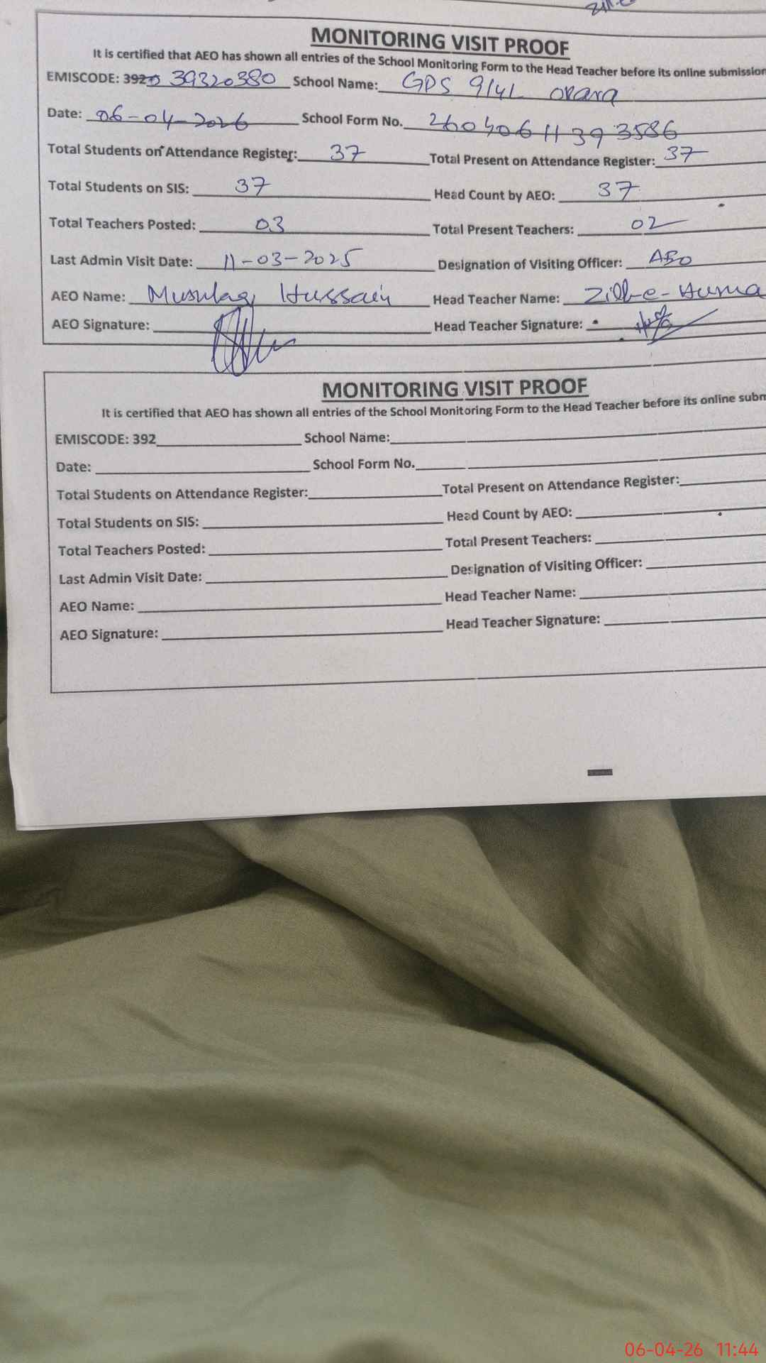 | Certified that this School was Inspected by the Undersigned MEA/DMO Today and the Information Stated Above is as Per Record. | |||||