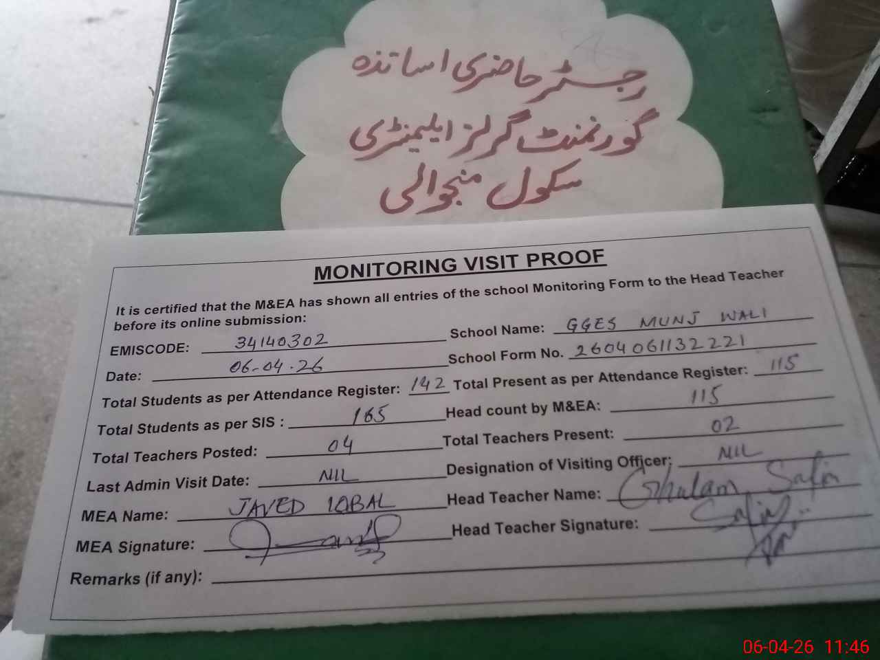 | EMIS Code: 34140302 | Name of School: GGES MUNJ WALI | |||