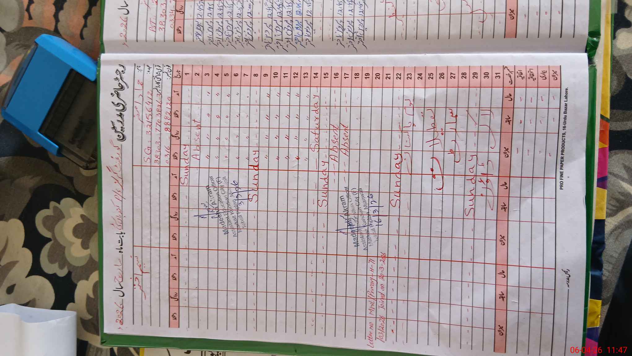 | CNIC | Full Name | Designation | R/C | Absence During Last Calender Month |