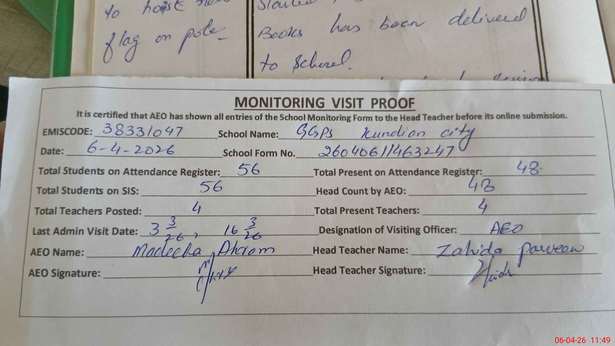 | Attendance Register | Head Teacher | MEA with School | Visit Proof |