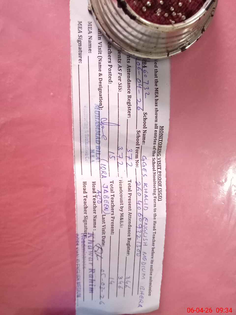 | Attendance Register | Head Teacher | MEA with School | Visit Proof |