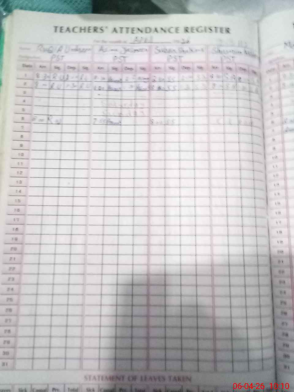 | Leave | Duty | Absent | Maternity | Medical | Ex- Pak |