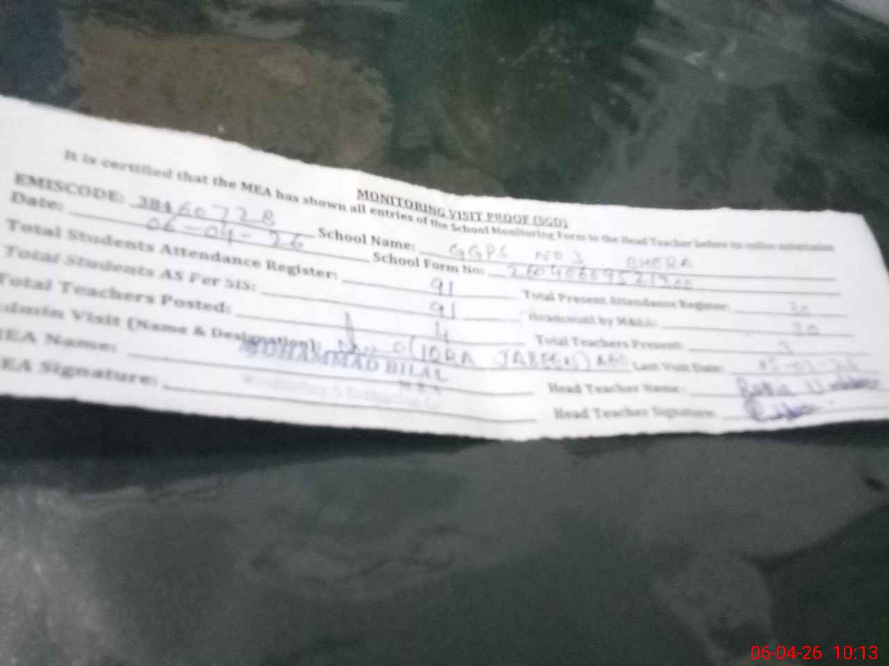 | Attendance Register | Head Teacher | MEA with School | Visit Proof |
