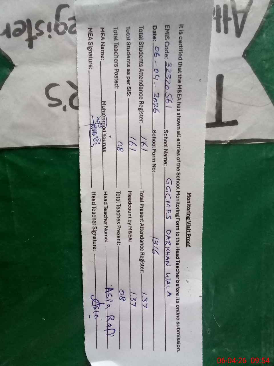 | Attendance Register | Head Teacher | MEA with School | Visit Proof |