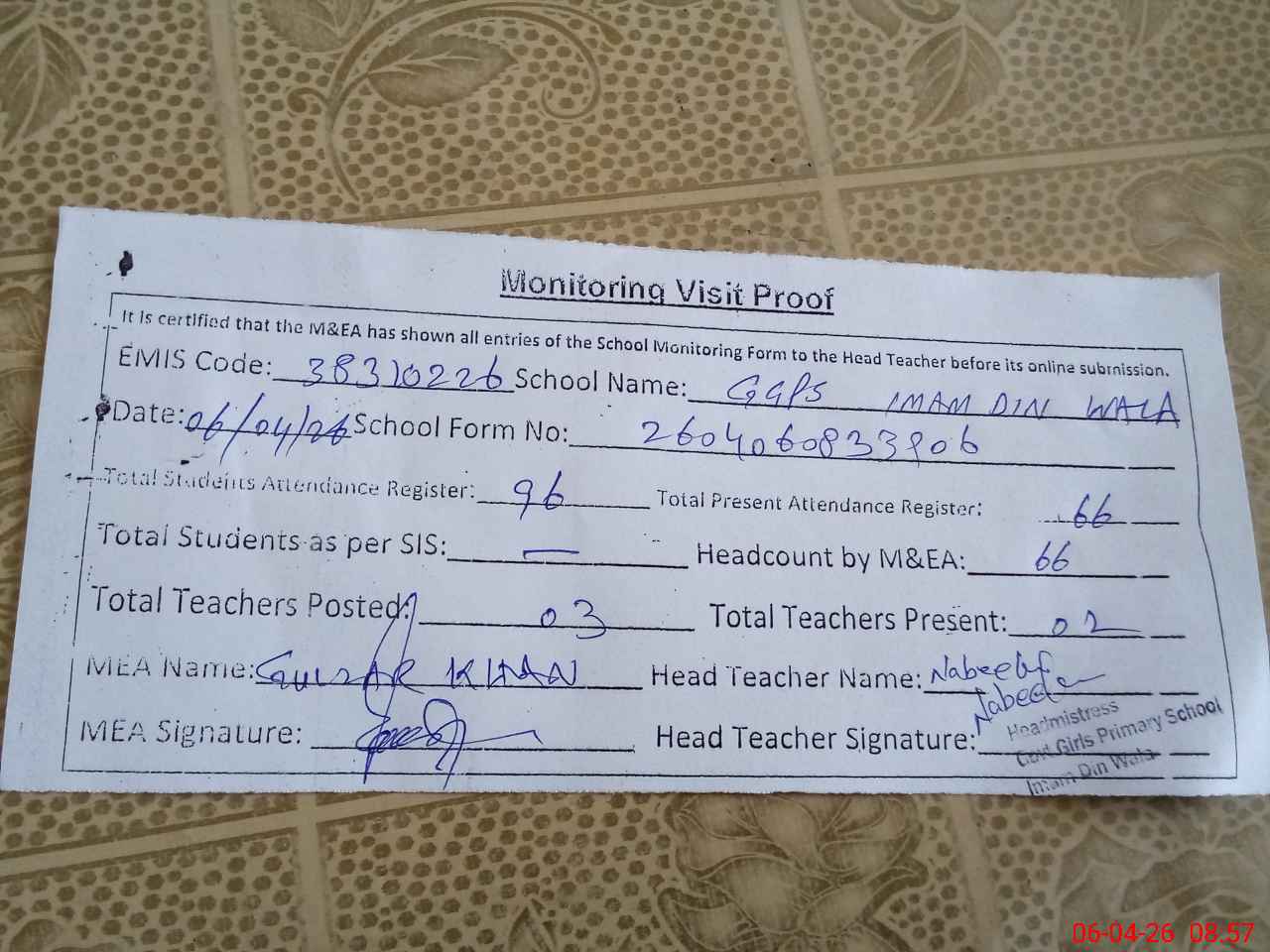 | Attendance Register | Head Teacher | MEA with School | Visit Proof |