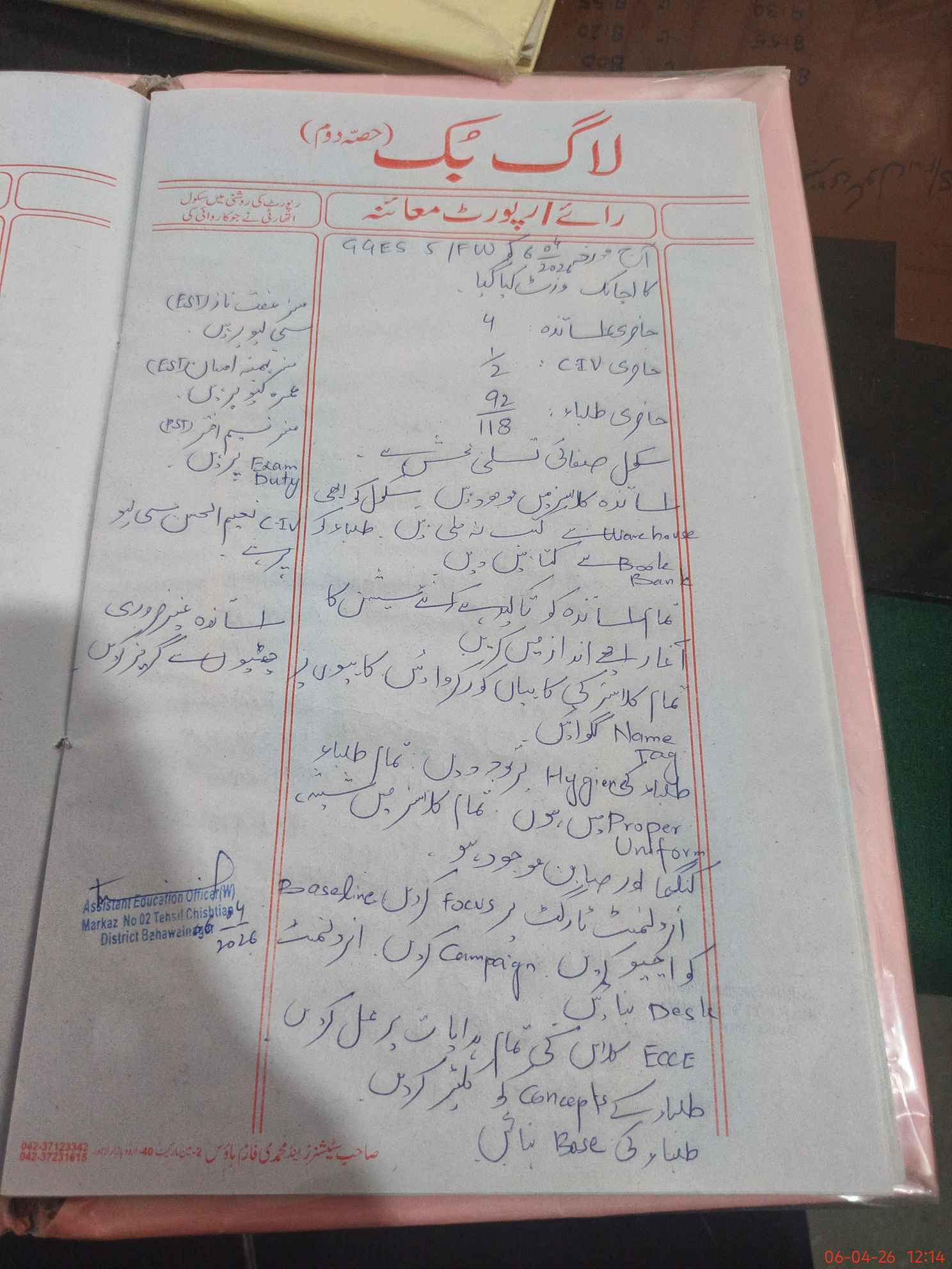 | District: BAHAWALNAGAR | Tehsil: CHISHTIAN | Markaz: CTN -II-FEMALE | Level: Middle | |