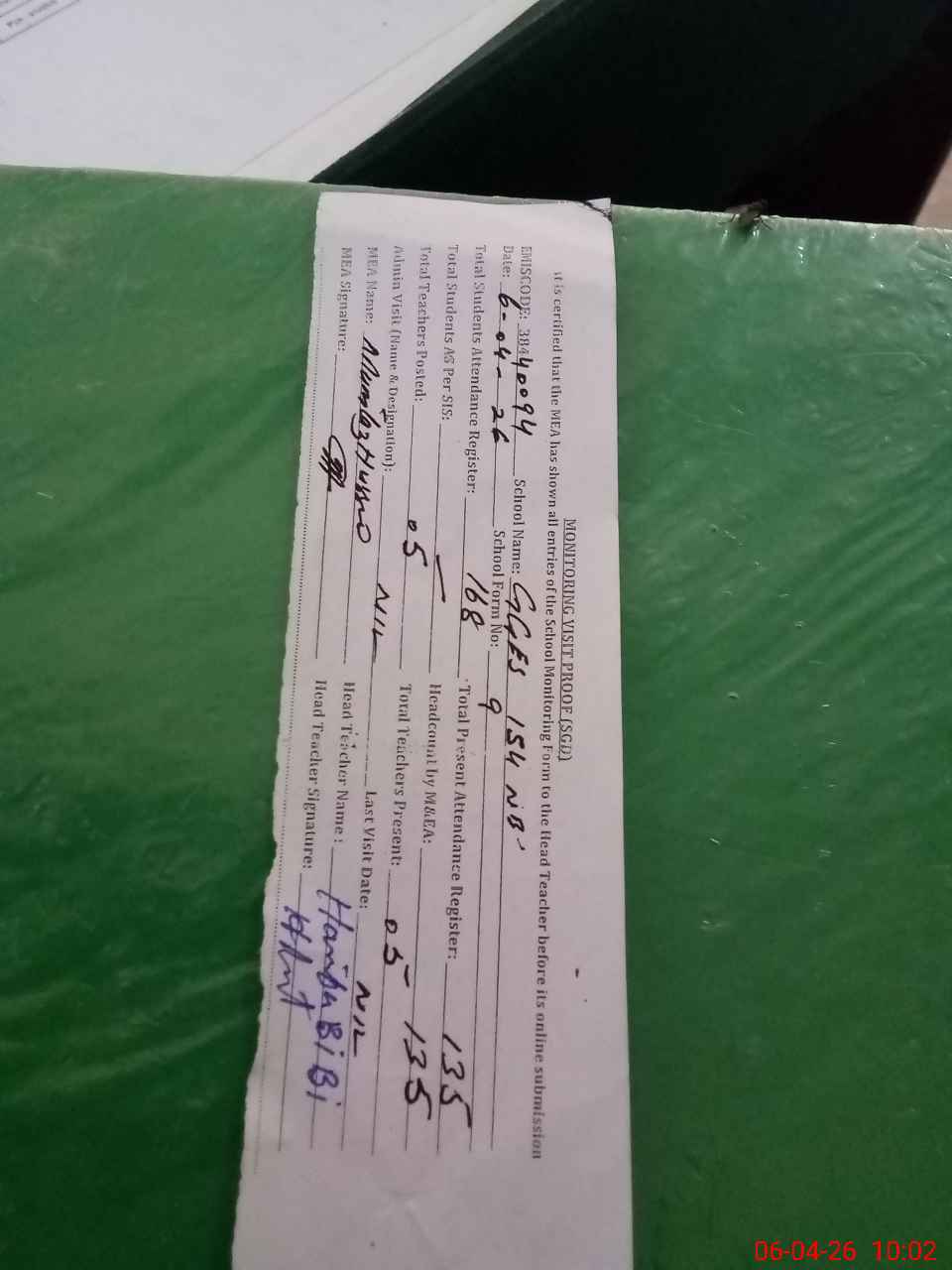 | Attendance Register | Head Teacher | MEA with School | Visit Proof |
