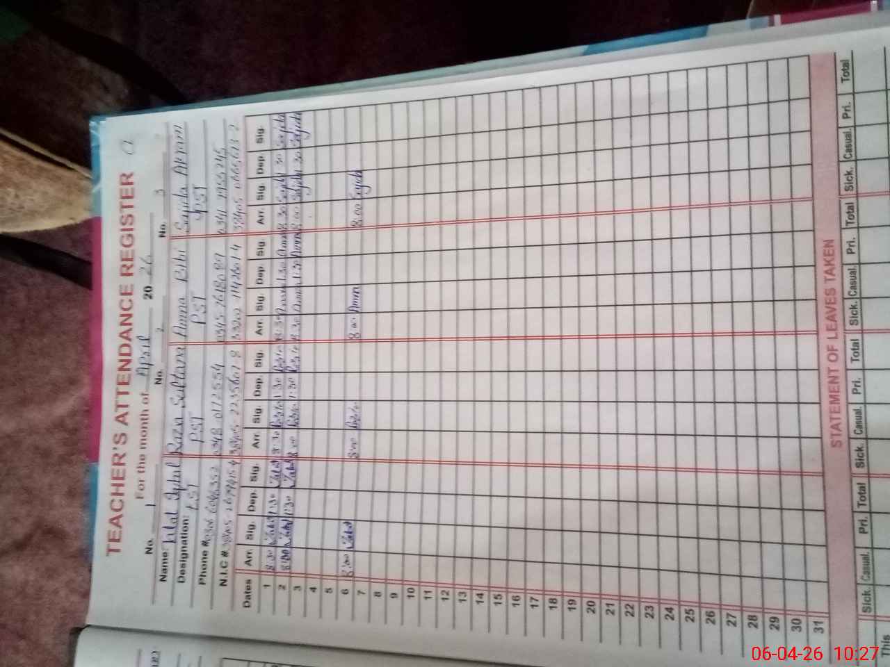 | Name: TA**** IQ**** Designation: (School Headmaster's/Headmistress's) EST Phone/Cell Number: 03**** |