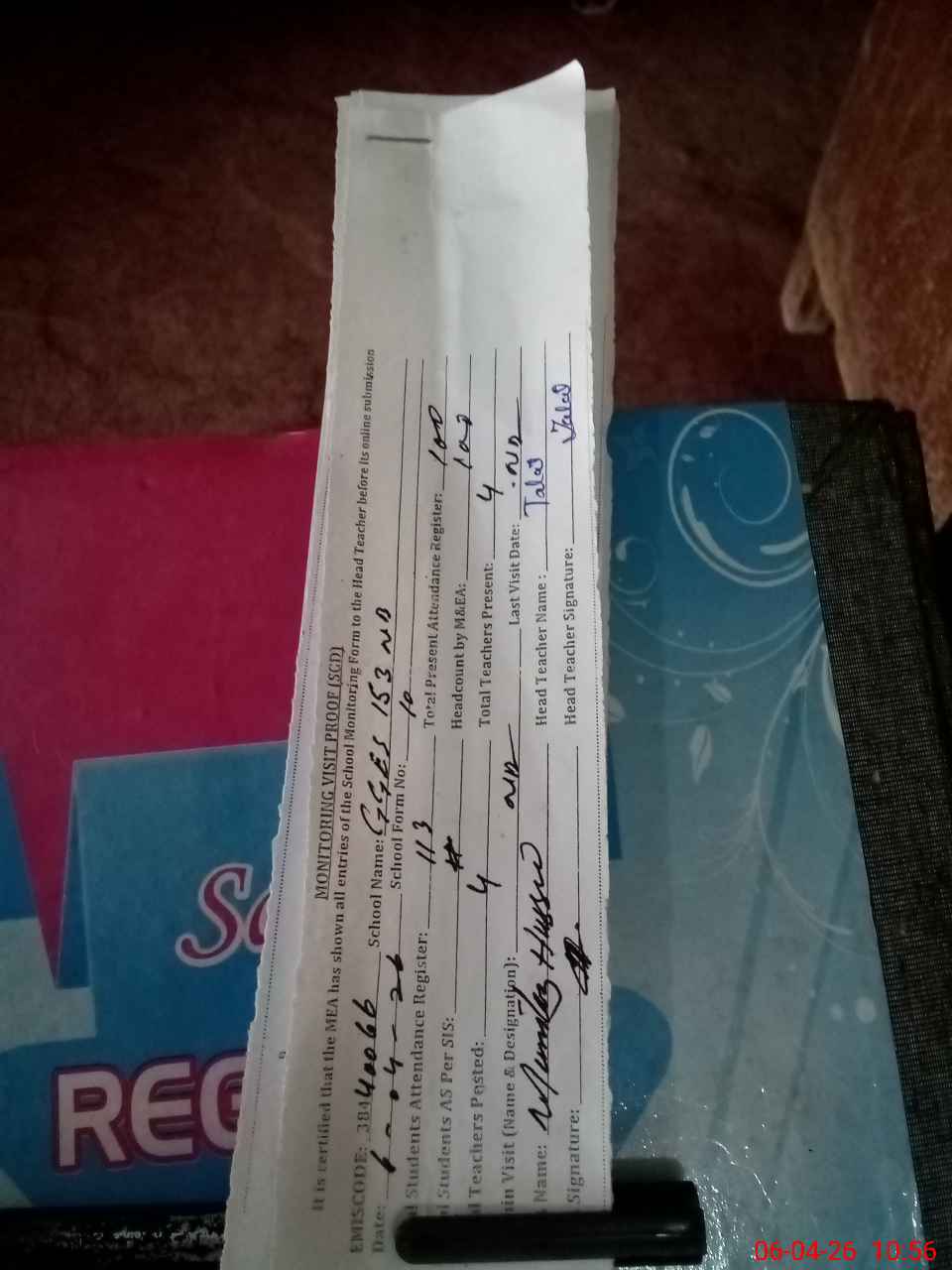 | Attendance Register | Head Teacher | MEA with School | Visit Proof |