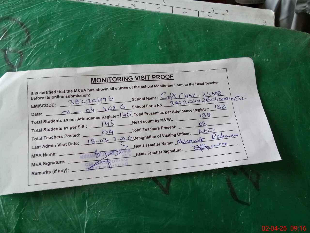 | EMIS Code: 38230476 | Name of School: GPS CHAK NO. 24 MB | |||
