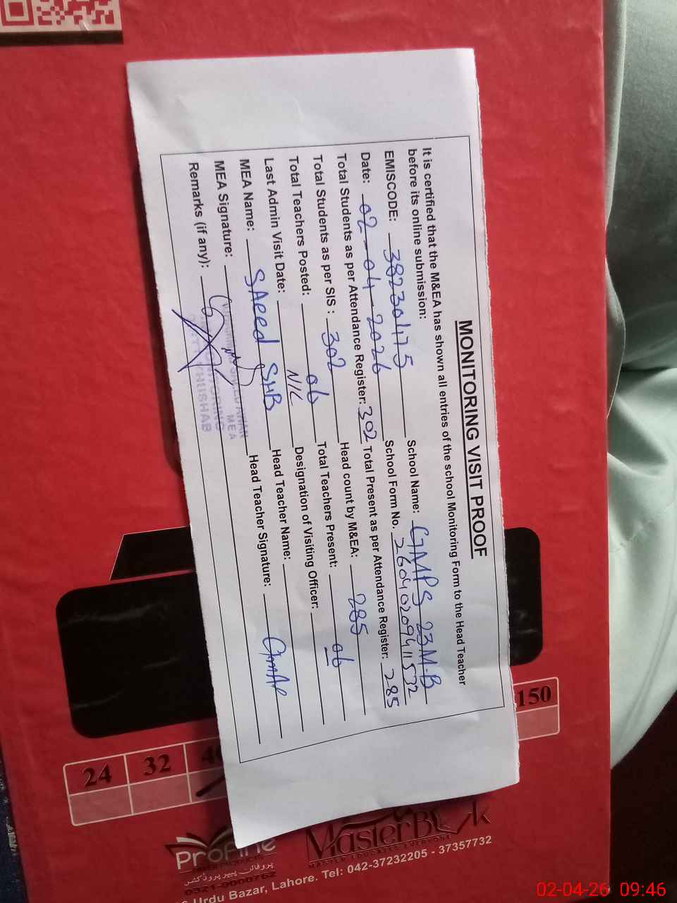 | EMIS Code: 38230475 | Name of School: GMPS CHAK NO. 23 MB | |||