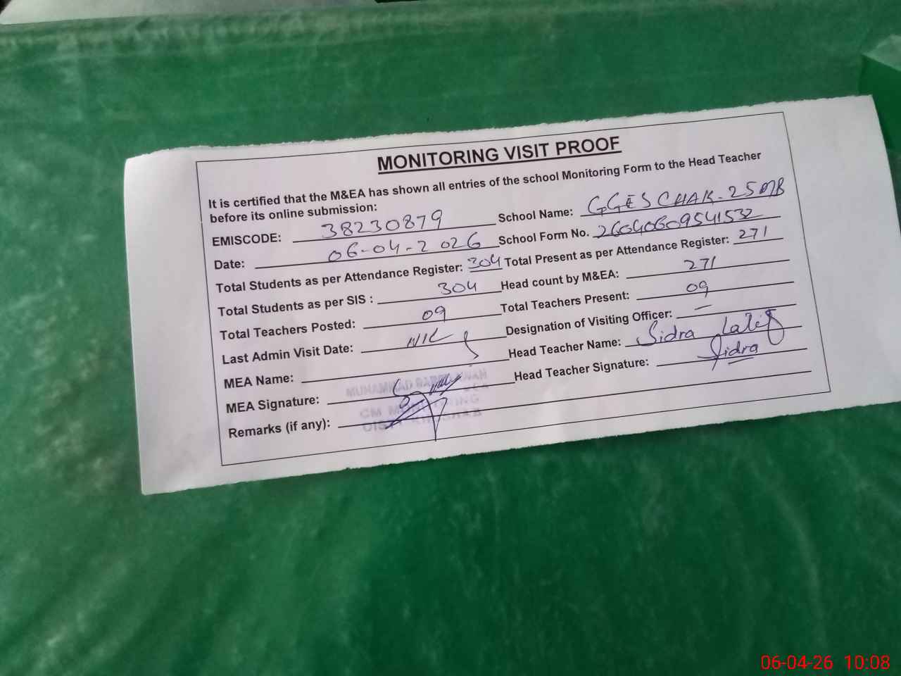 | Attendance Register | Head Teacher | MEA with School | Visit Proof |