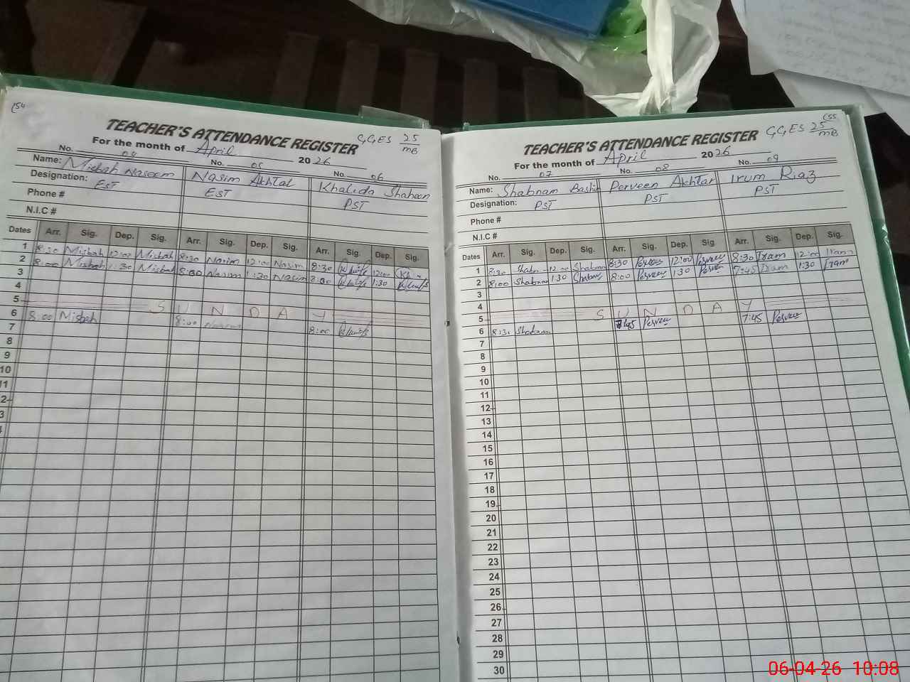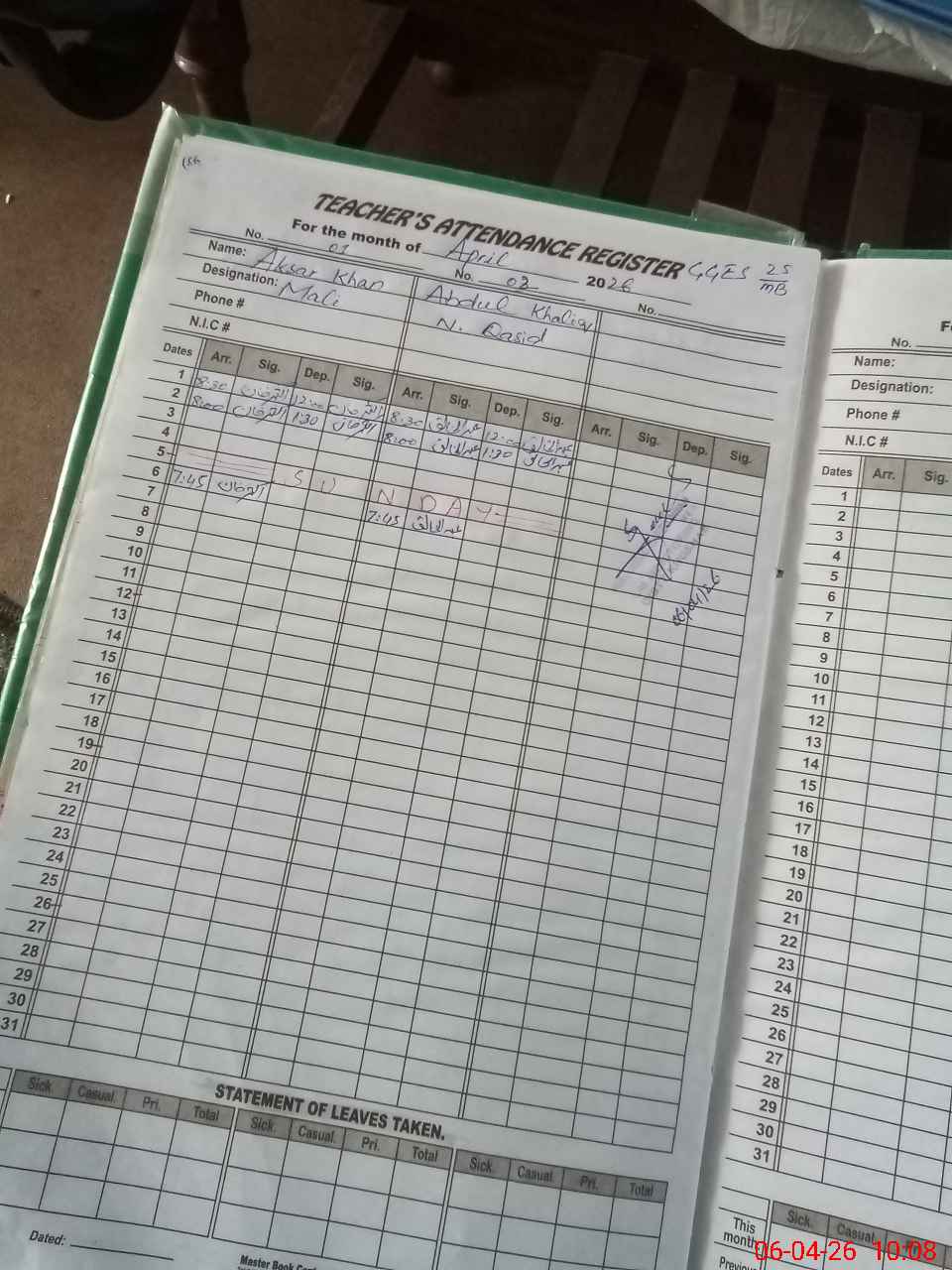 | CNIC | Full Name | Designation | R/C | Absence During Last Calender Month |