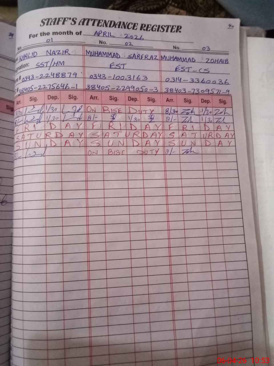 | Name: KH**** NA**** Designation: (School Headmaster's/Headmistress's) S.S.T.(G) Phone/Cell Number: 03**** |