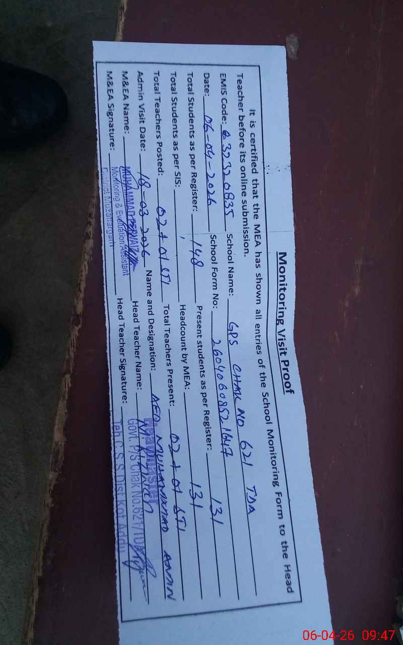 | EMIS Code: 32320835 | Name of School: GPS CHAK NO.621 TDA | |||
