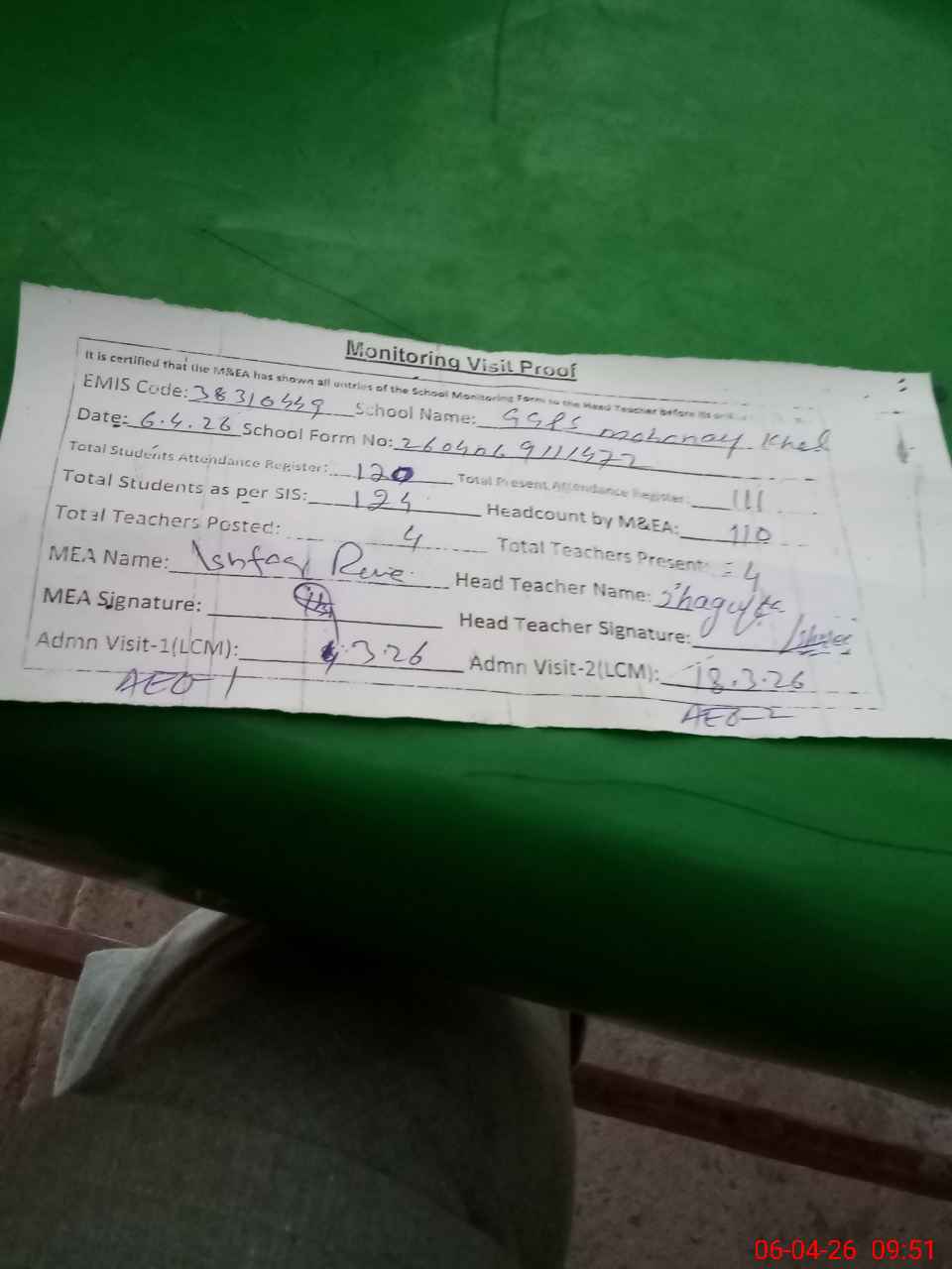 | Attendance Register | Head Teacher | MEA with School | Visit Proof |
