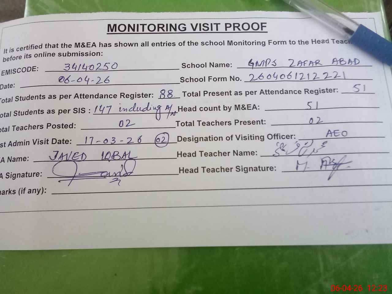 | Attendance Register | Head Teacher | MEA with School | Visit Proof |