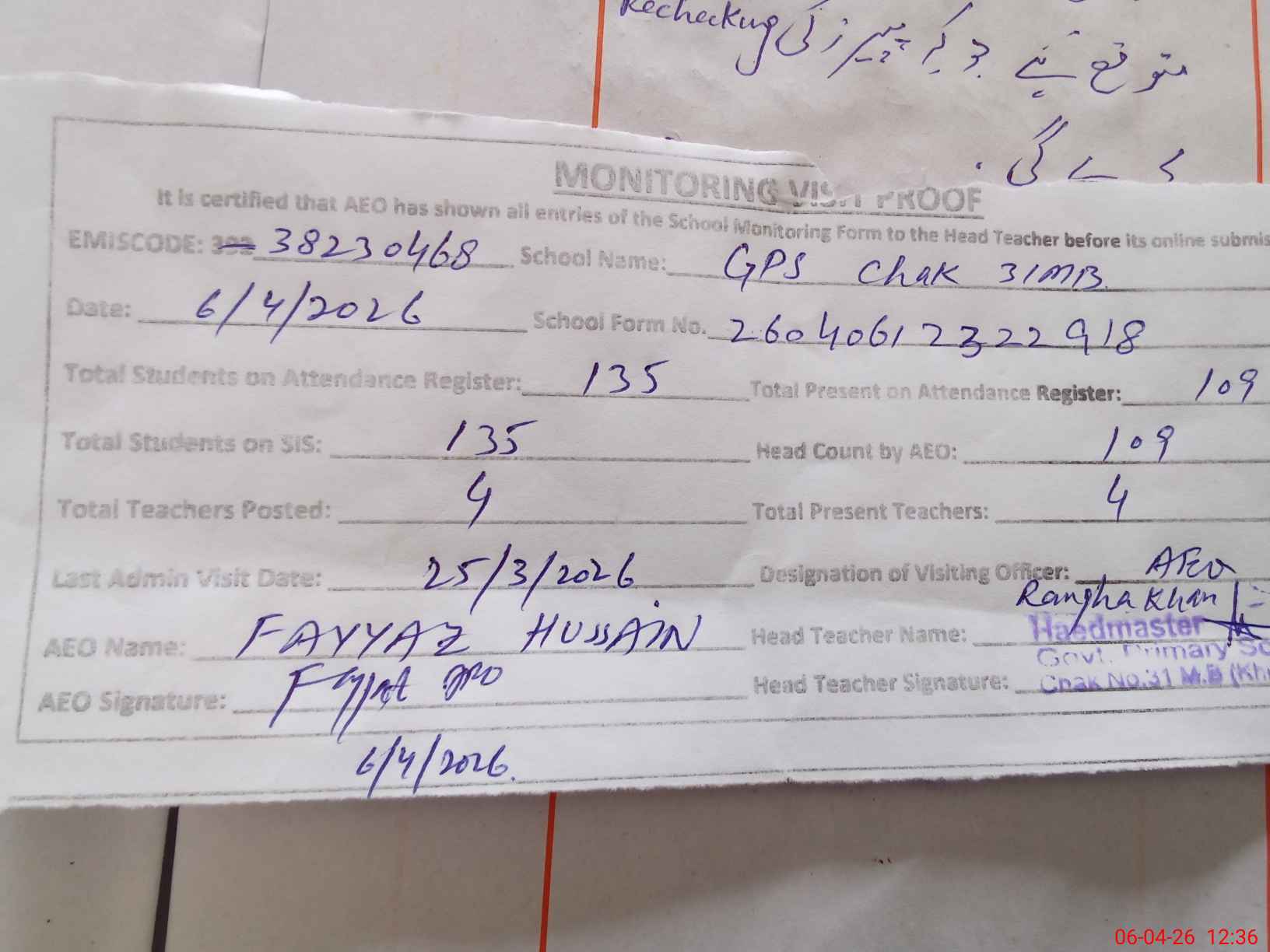 | Attendance Register | Head Teacher | MEA with School | Visit Proof |
