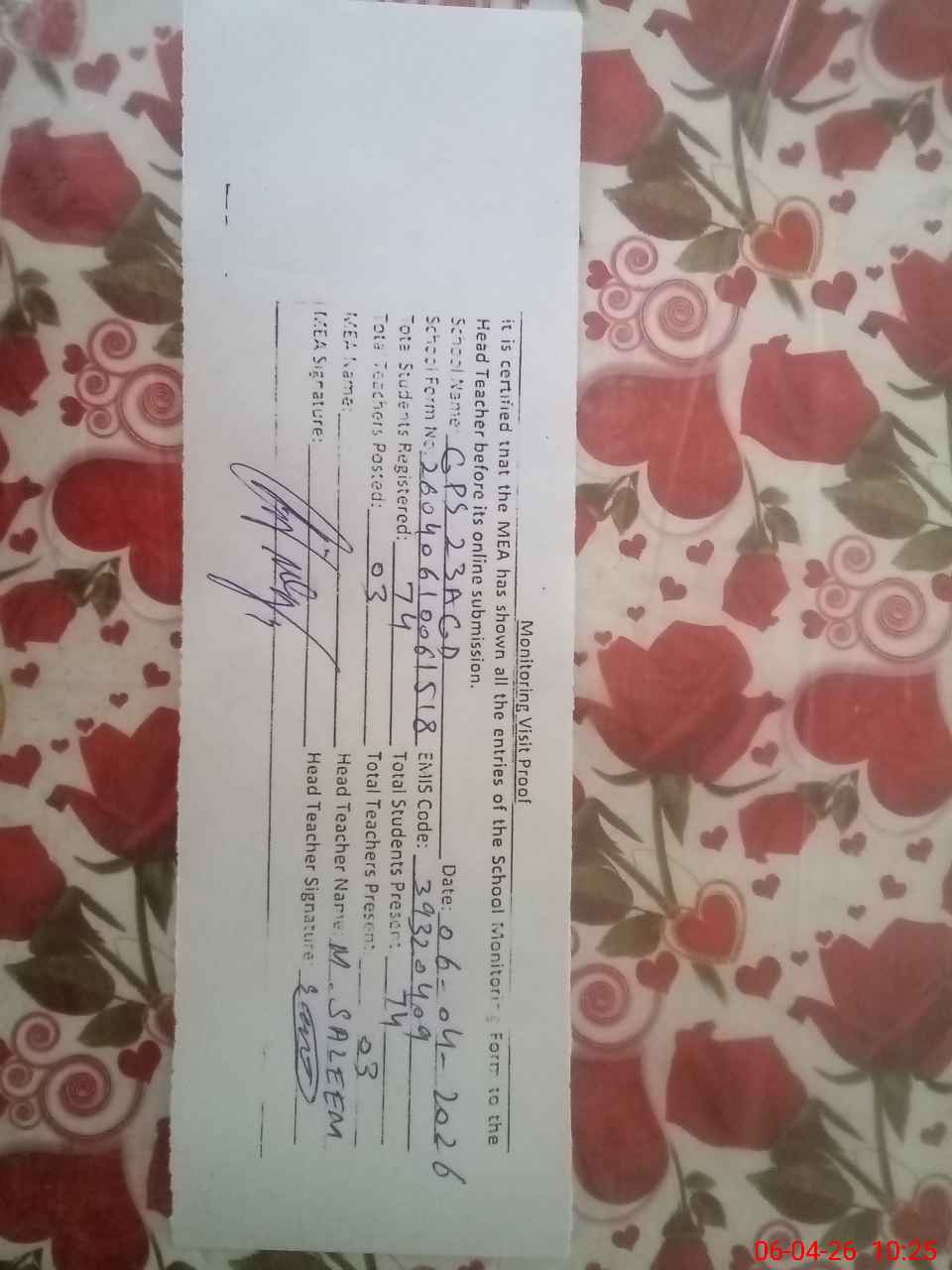 | Attendance Register | Head Teacher | MEA with School | Visit Proof |