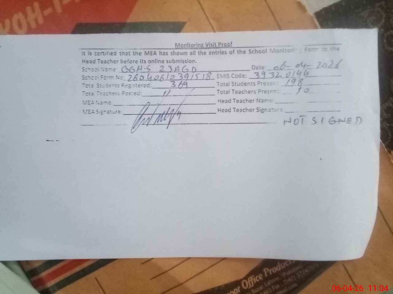 | Attendance Register | Head Teacher | MEA with School | Visit Proof |