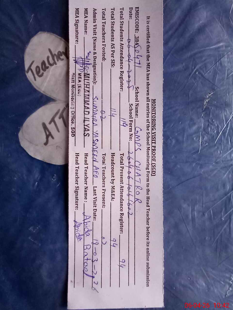 | Attendance Register | Head Teacher | MEA with School | Visit Proof |