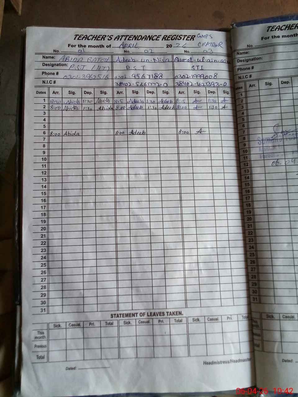 | Name: AA**** BA**** Designation: (School Headmaster's/Headmistress's) PST Phone/Cell Number: 03**** |