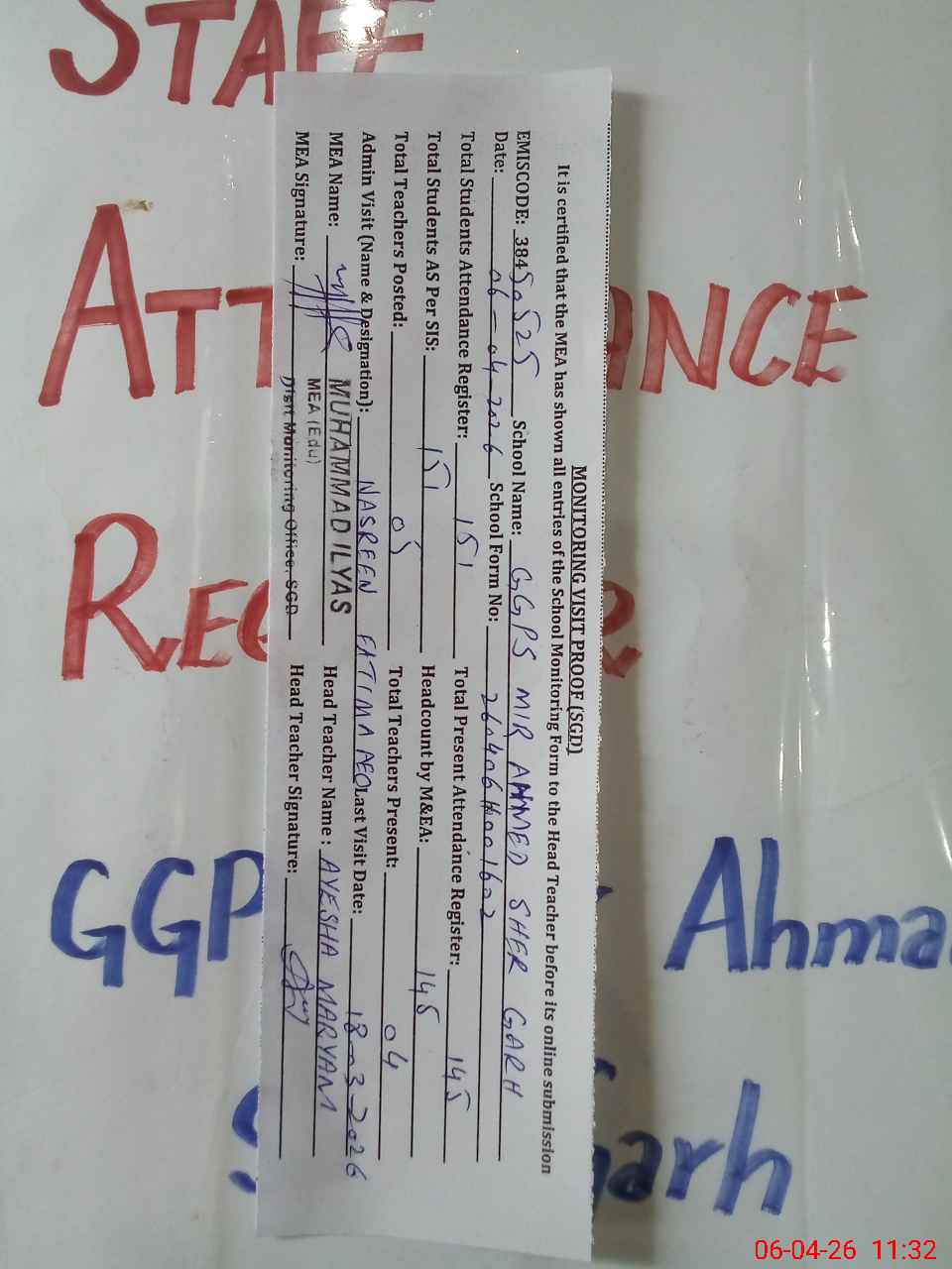 | Attendance Register | Head Teacher | MEA with School | Visit Proof |