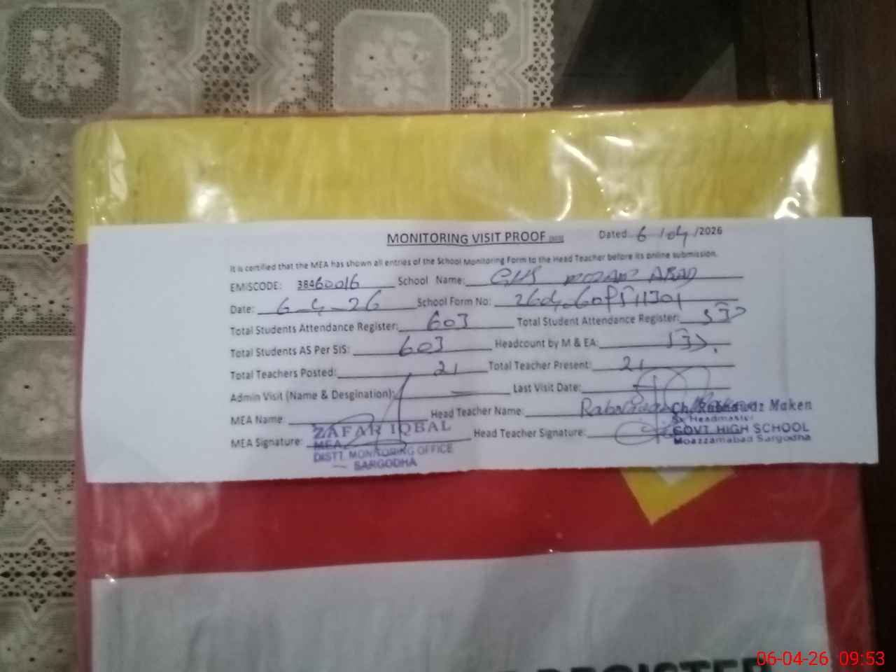 | Attendance Register | Head Teacher | MEA with School | Visit Proof |