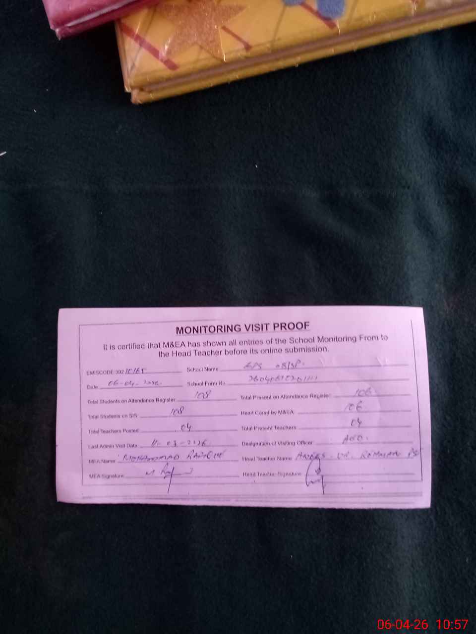 | Attendance Register | Head Teacher | MEA with School | Visit Proof |