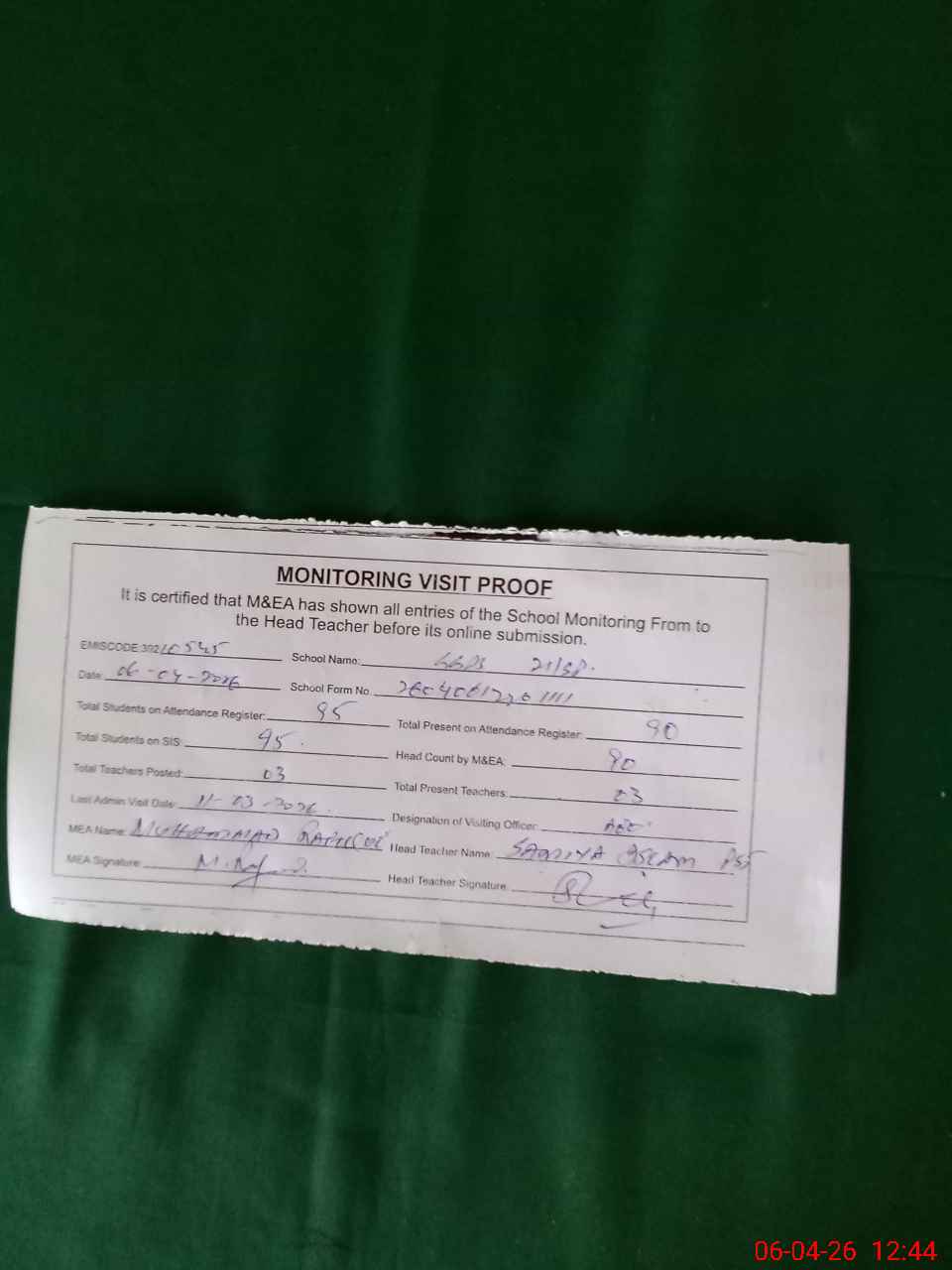 | Attendance Register | Head Teacher | MEA with School | Visit Proof |