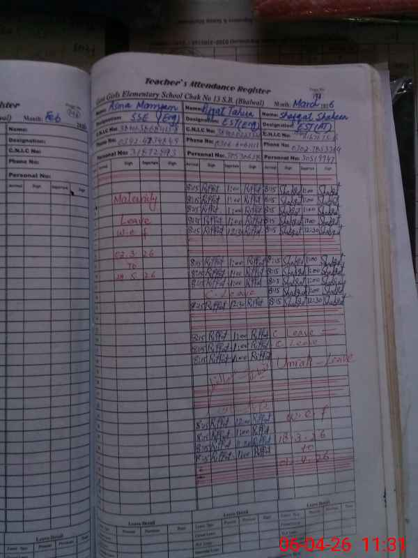 | Remarks (Use Separate Page if Required): During visit found 1- Teacher Qurtat ul ain and teacher Nuzhat Sultana were not present in school and no sanctioned documents available. | |||||