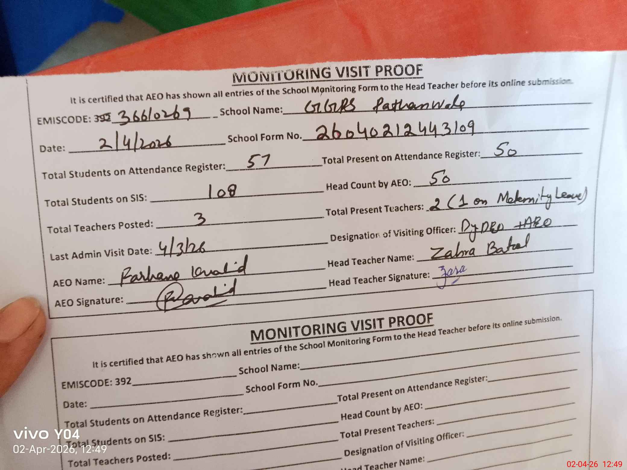 | Attendance Register | Head Teacher | MEA with School | Visit Proof |