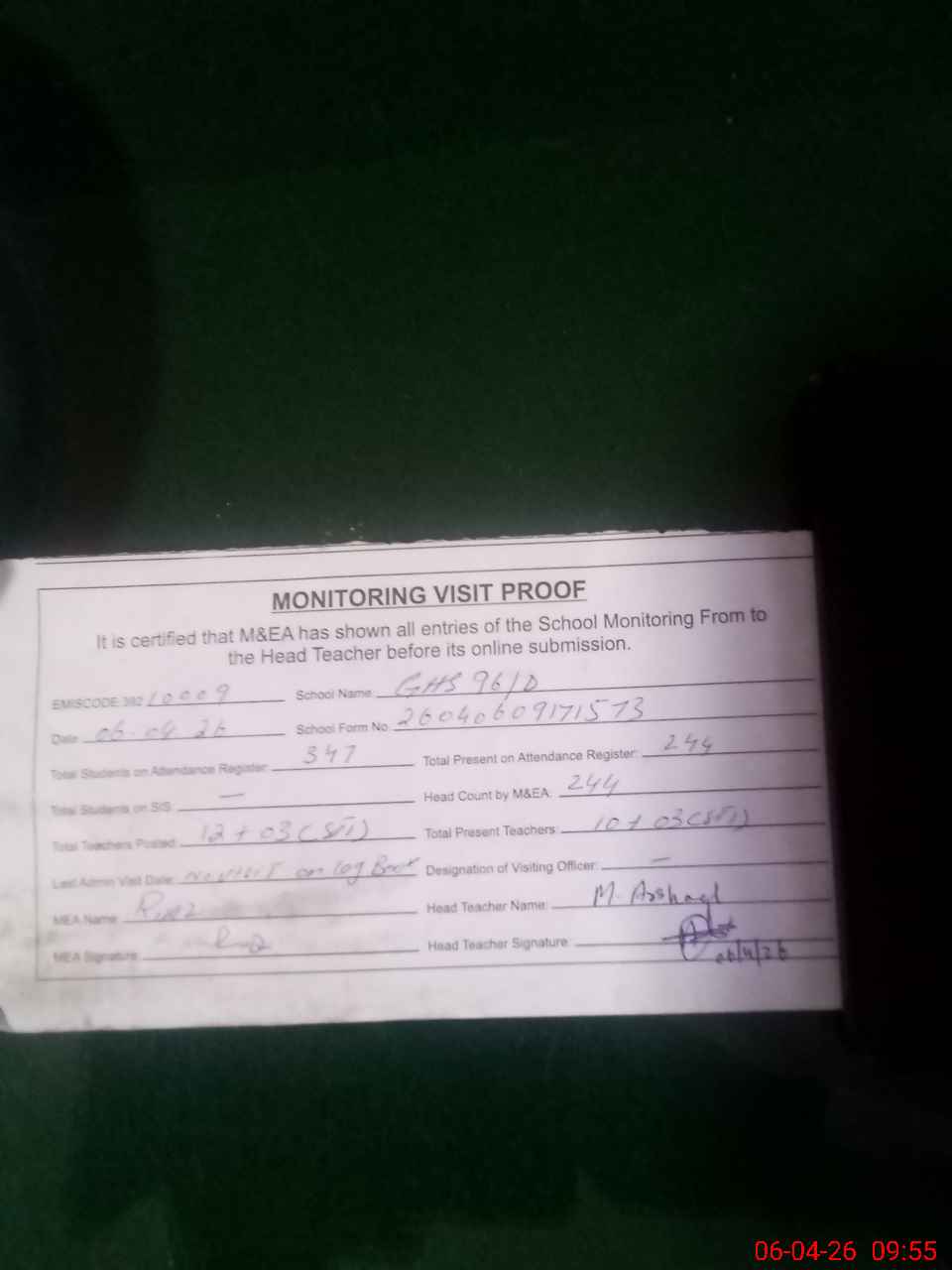 | Attendance Register | Head Teacher | MEA with School | Visit Proof |